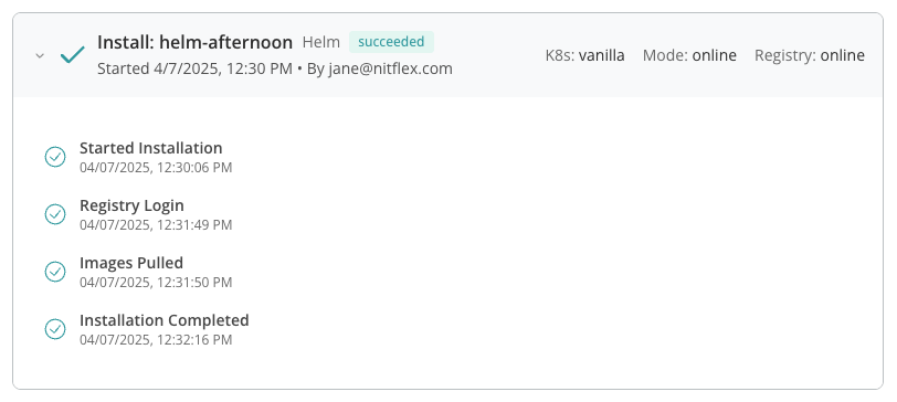 - For installations with Helm, the Enterprise Portal reports when your image registry was accessed and when application images were pulled, as shown below:
